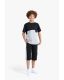 This trendy two-piece set is perfect for active boys who love a sporty yet stylish look. The color block t-shirt features a bold black upper panel and a light gray lower panel with a convenient chest pocket. The matching shorts are black with a distinctive gray side stripe, creating a coordinated and fashionable outfit. Made from soft, breathable fabric for all-day comfort.