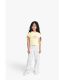 Adorable 2-piece girls pajama set featuring a yellow crop top with cute unicorn cat face print and matching white wide-leg pants with all-over animal pattern print. Perfect for comfortable sleepwear.