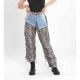 يتميز التصميم بخصر مرتفع يبرز جمال القوام، مع جزء علوي (Yoke) من الدينيم الفاتح يتناقض بشكل درامي مع الأرجل الواسعة المزدانة بطبعات تجريدية باللونين الأبيض والأسود (تشبه مزيجاً فنياً بين نمط التمويه وجلد النمر).