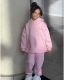 Kids’ hoodie and jogger set in soft pink, featuring a cozy hooded sweatshirt with front pocket and matching cuffed pants for everyday comfort.