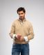 A refined beige quarter-zip sweater featuring a textured knit design, offering a polished yet relaxed look. Perfect for layering over shirts for a clean, smart-casual style.