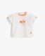 Dress your little one in this adorable safari-inspired tee, perfect for tiny adventurers. Crafted in soft cotton for all-day comfort, this white short sleeve t-shirt features a charming cartoon giraffe wearing a hat with the text 'Into The Wild' printed on the front. The back showcases a fun 'Adventures Wild' graphic with destination signposts including Forest, Koala, Safari, and more. Finished with vibrant orange contrast ribbed collar and sleeve cuffs for a playful pop of color. A small embroidered patch on the lower front hem adds a stylish finishing touch.