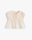 Elegant cream baby girl blouse featuring a smocked bodice with geometric texture, puff sleeves, decorative wooden buttons, and a flowy peplum hem. Perfect for special occasions.
