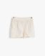 Soft cream textured shorts for babies, featuring decorative wooden buttons on the waistband, elastic waist for comfort, side pockets, and a relaxed gathered fit. Perfect for everyday wear.