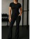 Sleek, stretchy, and effortlessly feminine — this ribbed black set hugs your shape while keeping it chill. The fitted tee and flared pants bring that perfect mix of sporty and sassy, whether you’re hitting the gym or owning the day in style.