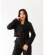 Cropped blazer with peak lapels and buttons at the front. Shoulder pads and long sleeves with buttons at the cuffs.