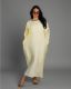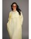 Luxurious Pale Yellow Kaftan Dress. An ultra-comfortable full-length modest gown featuring delicate textural details on the round neckline and full, airy sleeves. Designed for a supremely relaxed fit. Perfect for elegant loungewear or a modest resort look. Shop breathable kaftan dresses.