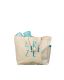 Stylish beige tote bag with bold blue lettering, perfect for carrying all your essentials in a fun and fashionable way.