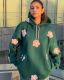 Oversized Dark Green Hoodie with Pink Flower Patches