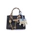 A structured leather handbag with a gold-tone charm chain and a patterned scarf-wrapped handle, blending elegance with a bold, stylish touch.
